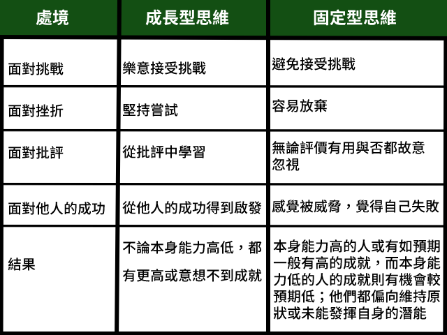 美國史丹福大學心理學教授Dr. Carol Dweck提出了兩種心態模式:「成長型思維」(Growth Mindset)及「固定型思維」(Fixed Mindset)。擁有成長型思維的人相信人的能力是可以透過努力改變的,而擁有固定型思維的人則認為人的能力與身俱來,不能改變的。除了對人的能力有不同的信念外,這兩種思維的人在面對不同的處境的反應及態度也有極大的差異,如下: